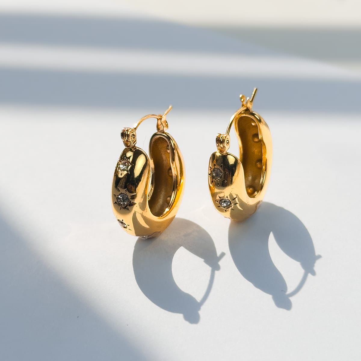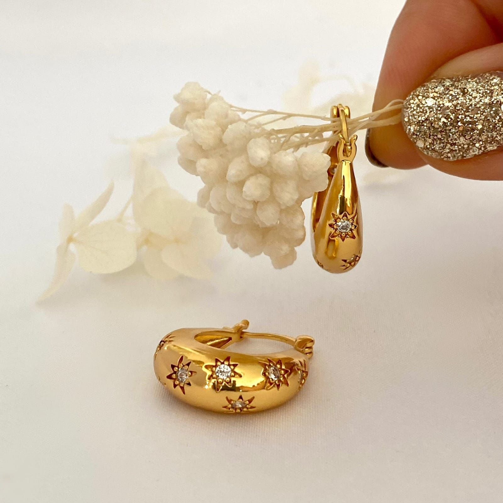 Shine brighter than the stars! Introducing our Starfall Huggie Hoops, the perfect way to add a touch of celestial magic to your everyday look. These chunky, gold-plated hoops feature a beautifully polished finish and are adorned with tiny, shimmering cubic zirconia stars that catch the light from every angle.